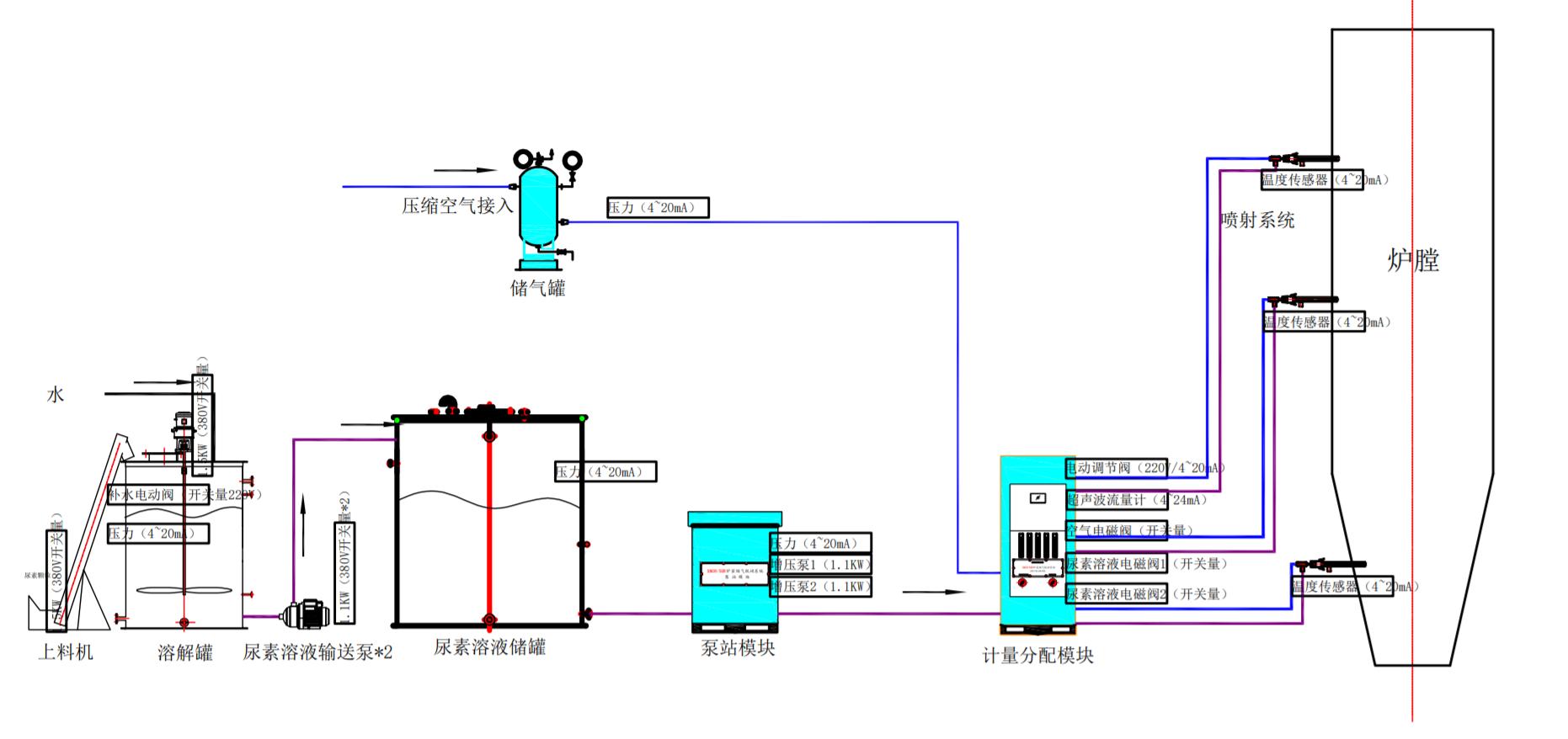 SNCR脫硝系統主要由還原劑溶液/制備系統(還原劑配置系統/氨水卸載系統)、還原劑溶液儲存系統、加壓及控制系統(還原劑增壓&空氣增壓)、控制計量分配系統、霧化噴射系統組成。
